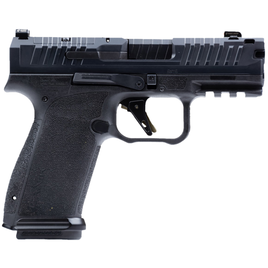 The Canik MC9 Prime features a 3.64" compensated barrel; flat face trigger with 90 degree break; Night Fision Tritium night sights; full grip surface stippling with increased texture and a black nitride, optic ready, compensated slide with lighting cuts.