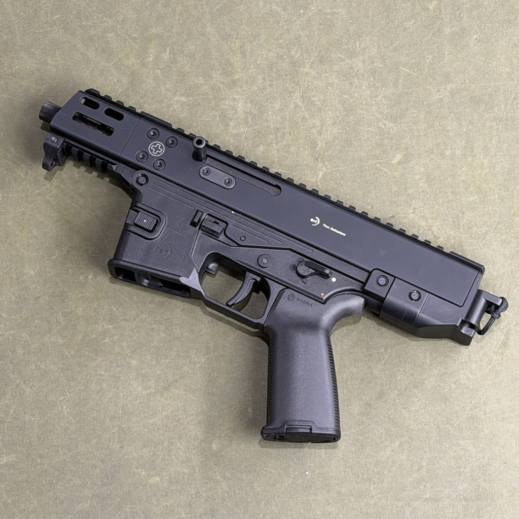 Named for the grasshopper mouse, a carnivorous rodent that is known for eating scorpions, the GHM9 9mm Pistol is a made by Swiss arms manufacturer B&T. The GHM9 pistol is built on a direct blowback operating system with a built-in recoil buffer spring. All of the controls on the GHM9 are ambidextrous and the charging handle can be positioned on the right or left hand side. The barrel of GHM9 is free-floated adding to the accuracy of the pistol and reducing the time it takes for the barrel to cool down after rapid fire. The barrel is threaded and ready for suppressor use.