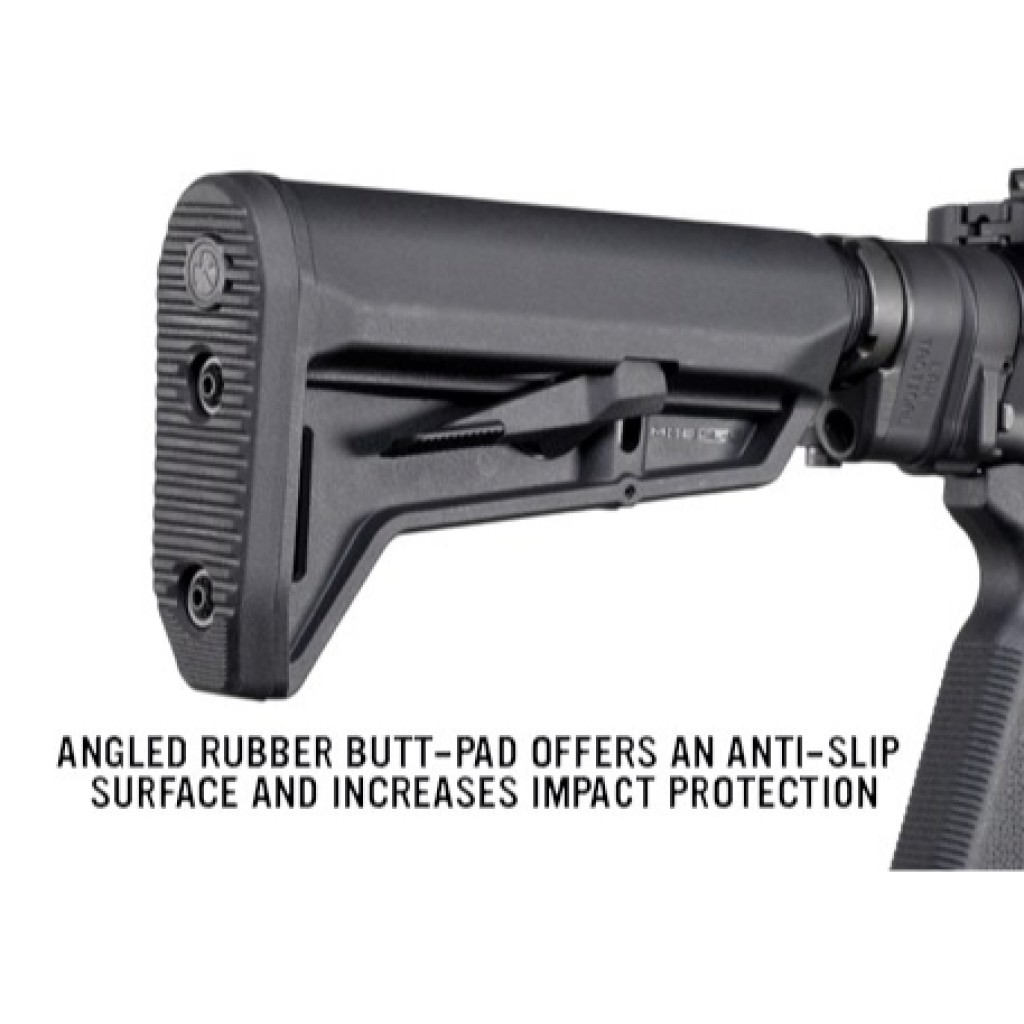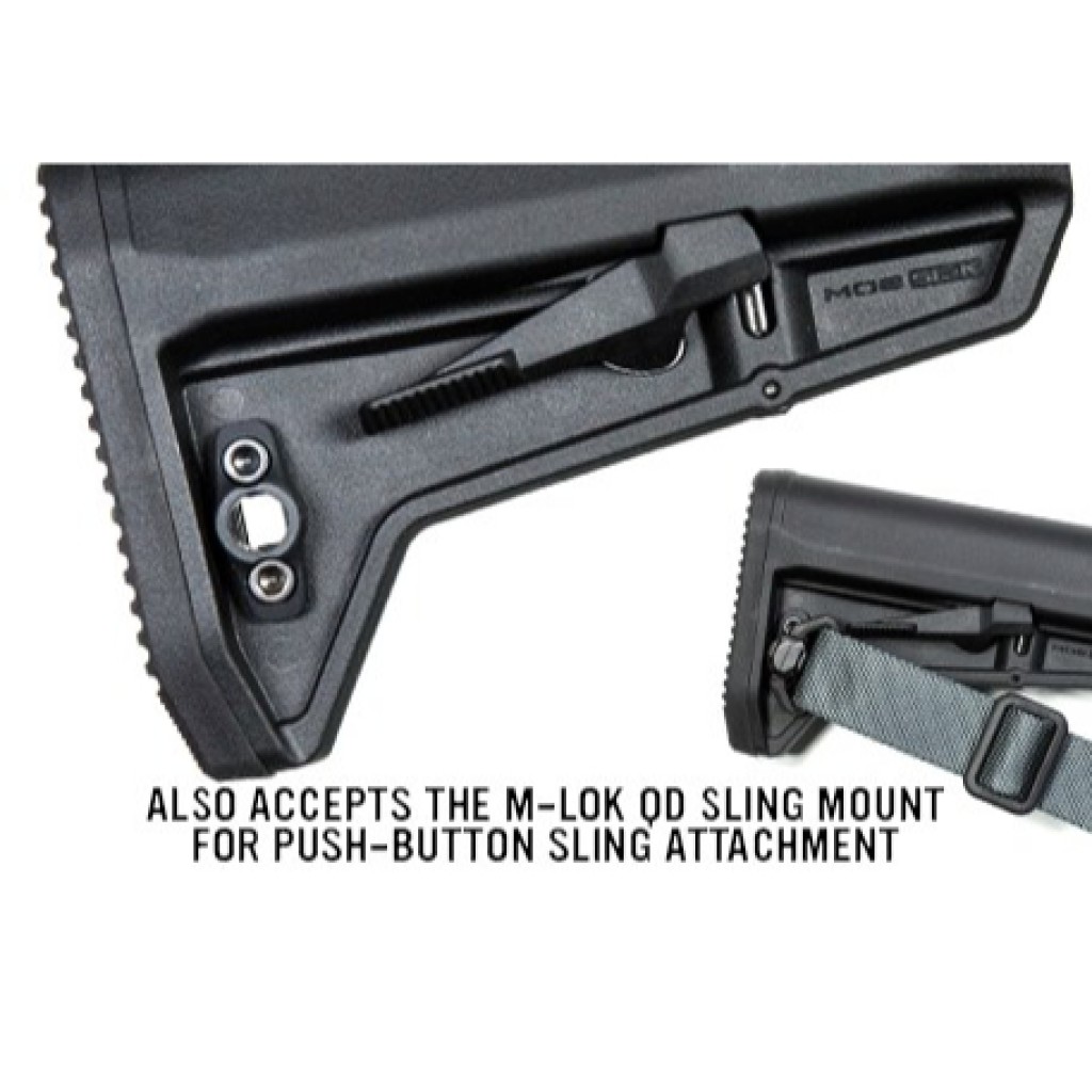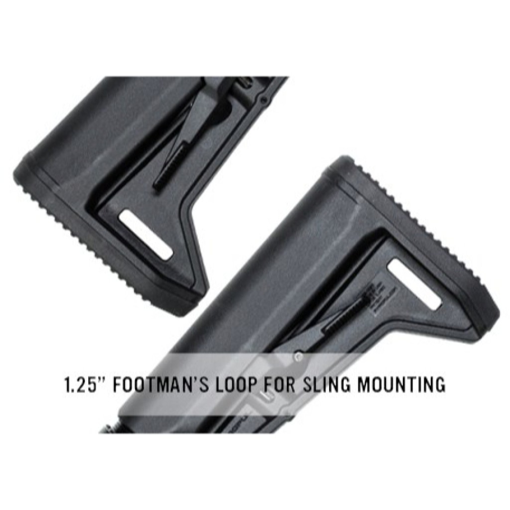 Features a short and slim profile, a smaller rubber butt-pad with rolled toe for easy shouldering and sure grip, and a 1.25" footman's loop with the ability to accept an optional M-LOK QD Sling Mount for push-button style QD sling swivels. A new, unique, ambidextrous release latch minimizes rattle on the receiver extension without requiring additional locks, levers, or springs*.