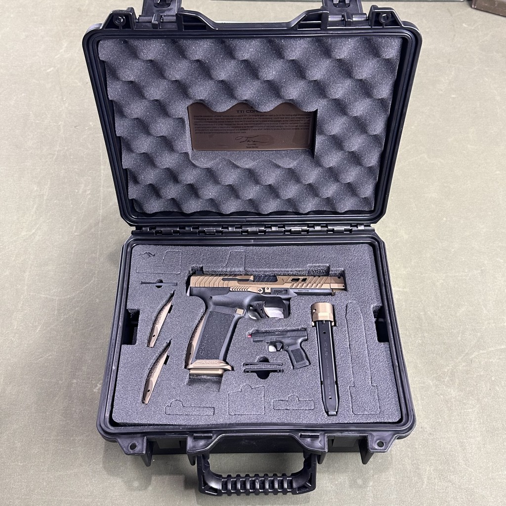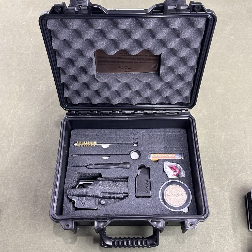 Taran Tactical Innovations and Canik have partnered up to bring you the Canik TTI Combat Semi-Automatic Pistol. The polymer frame with unique grip texture was designed by Taran Butler himself. The TTI Combat features a ported and fluted barrel, Canik's first compensator for recoil reduction, and flat-faced trigger with a 90º break and diamond checkering. The newly-designed slide lock is easy to find and push for use as a slide release. An optics cut is designed to accept several optics including the Trijicon RMR and SRO. You'll get machined-aluminum TTI +3 magazine base pads, a custom holster, a hard case, and a commemorative challenge coin.