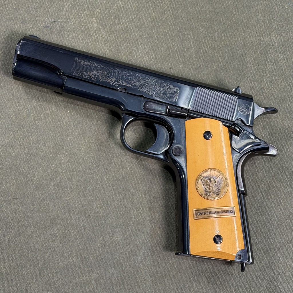 Colt WWI Commemorative Model 1911. 2nd Battle of the Marne manufactured in 1968. The right side of the slide is marked with a banner reading "1917 / WORLD WAR I COMMEMORATIVE / 1967" and "COLT'S PT.F.A. MFG. CO. HARTFORD, CONN. U.S.A.". The chamber on each pistol is marked "COLT .45 AUTO" and also has a "VP" proof. The right side of each of the frames with the serial number. The left side of the Second Battle of the Marne slide is engraved with a scene involving American soldiers firing at German soldiers across a river and at the rear with the Rampant Colt logo. The Second Battle of the Marne grips are smooth French Holly.
