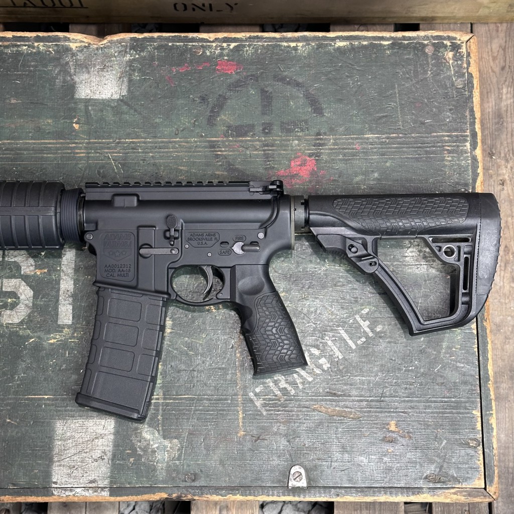 The Adams Arms model AA-15 includes a picatinny railed gas block with 3 adjustable settings and M4-style furniture. This rifle also includes a Daniel Defense pistol grip, alongside a Daniel Defense 6-position stock.