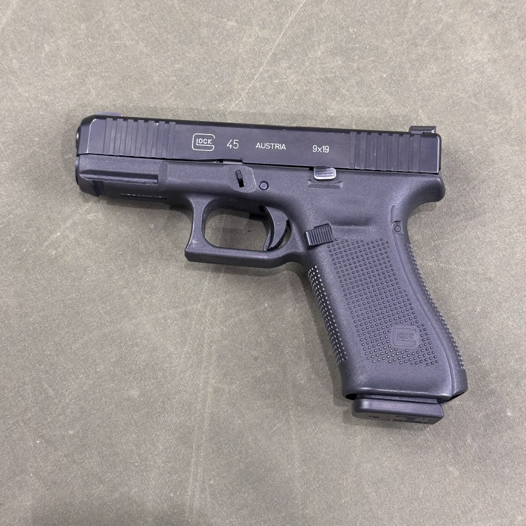 Crafted with a durable polymer frame featuring a Picatinny rail, this full-size firearm offers a comfortable grip with its black interchangeable backstrap grips. The double-action-only (DAO) action, paired with a 5.50-pound trigger pull weight, provides smooth operation with every shot. Equipped with a 4.02-inch barrel and fixed serrated steel slide, complemented by a GLOCK Marksman Barrel (GMB) for enhanced precision. Safety features include a firing pin/trigger block and the Safe Action® System for peace of mind. With one magazine, a mag loader, cleaning kit, pistol case, backstrap set, and gun lock included, the GLOCK 45 is ready for action straight out of the box. Experience faster reloads with the flared mag-well and ergonomic improvements like ambidextrous slide stop levers and customizable frame sizes.