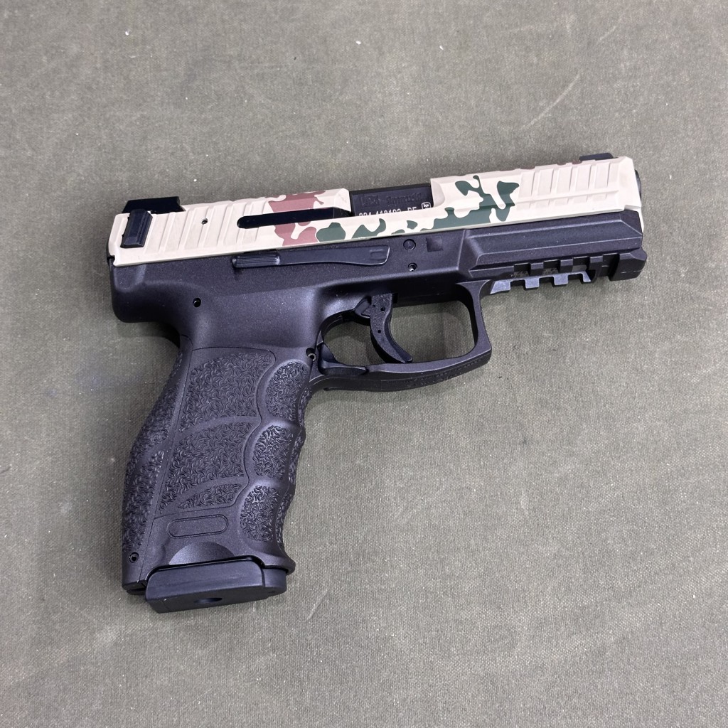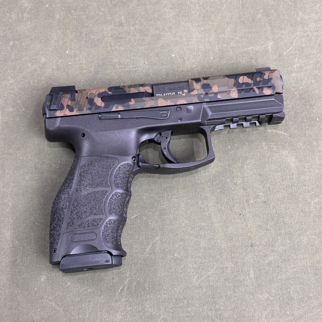 The 75th Anniversary set creates a very limited opportunity to own a piece of our 75-year history with an exclusive two-pistol set of 75th anniversary HK VP9 pistols. Only 1,000 pairs will be sold and sets will not be broken up. Decorated in Flecktarn and Tropentarn, the camo patterns utilized by the German armed forces, the Bundeswehr. The HK VP9 is Heckler & Koch's latest and most successful pistol design. Featuring the VP9 unique striker firing system with an enhanced HK "light pull" trigger; Ergonomic, adjustable grip, the adaptable grip frame allows you to interchange both backstraps and grip panels in 27 unique configurations to fit your hand; VP trigger has a short, light take-up with a solid, single action type break followed by a short positive reset; all controls are completely ambidextrous including HKs patented charging supports; VP pistols uses the proven P30 steel magazine; extended Picatinny MIL-STD-1913 rail molded into its polymer frame for mounting lights and accessories; captive flat recoil spring helps reduce the recoil forces effecting the operator and the handgun; cold hammer forged barrel made from cannon grade steel. Includes four 17rd magazines, custom cut polymer hard case and commemorative 75th Anniversary coin.