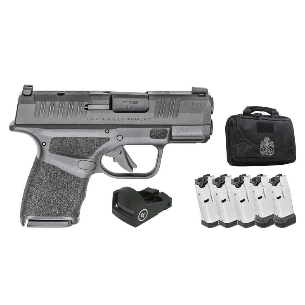 Springfield Armory micro-compact Hellcat features unique top slide serrations to maximize your grip on the slide; non-proprietary accessory rail allows you to accessories with your favorite light and/or laser; Tritium/Luminescent front sight, Tactical Rack U-Notch rear sight; reversible mag release, loaded chamber indicator and custom pressure activated grip texture. Gear Up 25 package includes Crimson Trace CT-1500 Red Dot Optic, 5 magazines and dual range bag.
