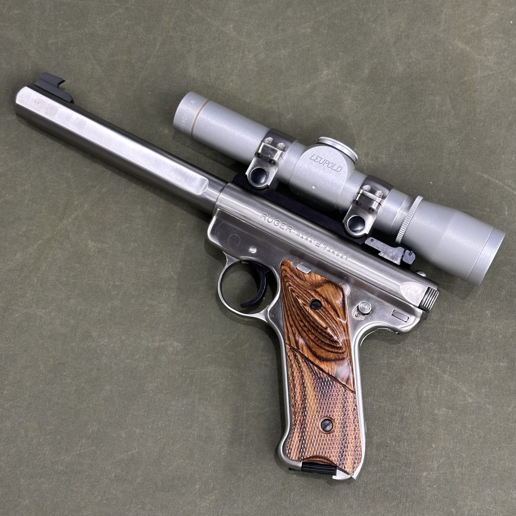 Ruger Mark II Target in good condition. Come with checkered wood grips, silver finish, and 1 magazine included. A matching silver Leupold scope also is included.