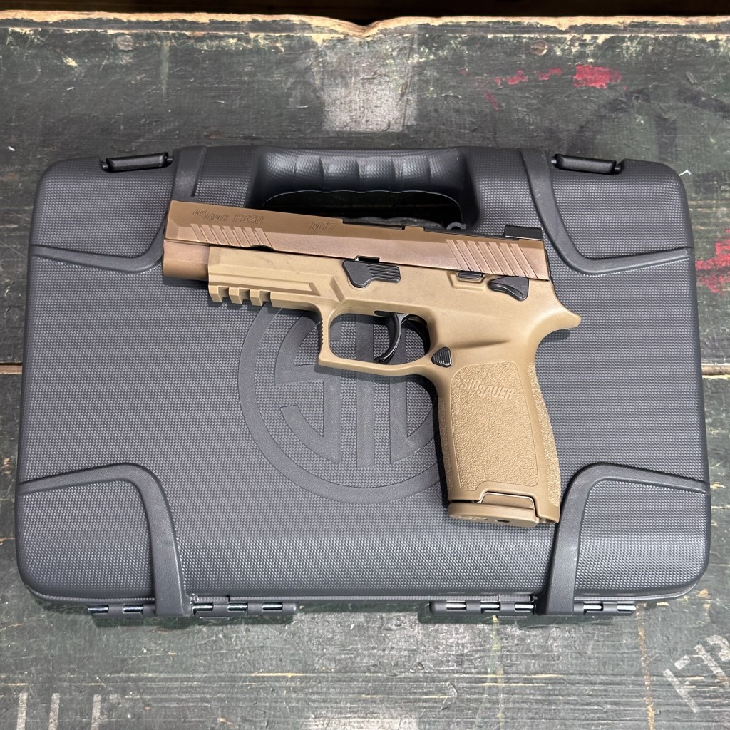 The P320-M17 is a 9mm, striker-fired pistol and comes with one (1) 17-round magazine and two (2) 21-round magazines. The pistol features a coyote-tan PVD coated stainless steel slide with the same optic cut as specified by the MHS contract, and black controls just like the pistols currently being shipped to the U.S. Army; it comes equipped with a SIGLITE front night sight and removable Night Sight rear plate. The P320-M17 features a coyote-tan carry-length grip module, available in three sizes, and comes standard with a manual safety. Non-Manual-safety models are also available (320F-9-M17).