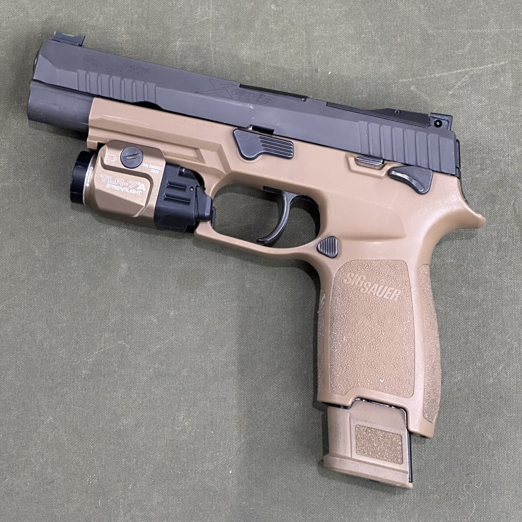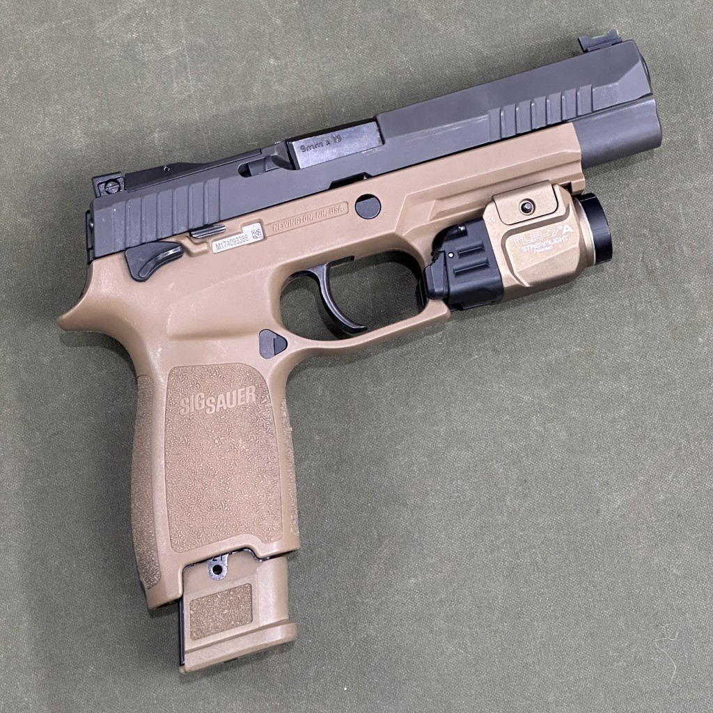 The P320-M17 is a 9mm, striker-fired pistol and comes with one (1) 17-round magazine and two (2) 21-round magazines. The pistol features a coyote-tan PVD coated stainless steel slide with the same optic cut as specified by the MHS contract, and black controls just like the pistols currently being shipped to the U.S. Army; it comes equipped with a SIGLITE front night sight and removable Night Sight rear plate. The P320-M17 features a coyote-tan carry-length grip module, available in three sizes, and comes standard with a manual safety. Non-Manual-safety models are also available (320F-9-M17).