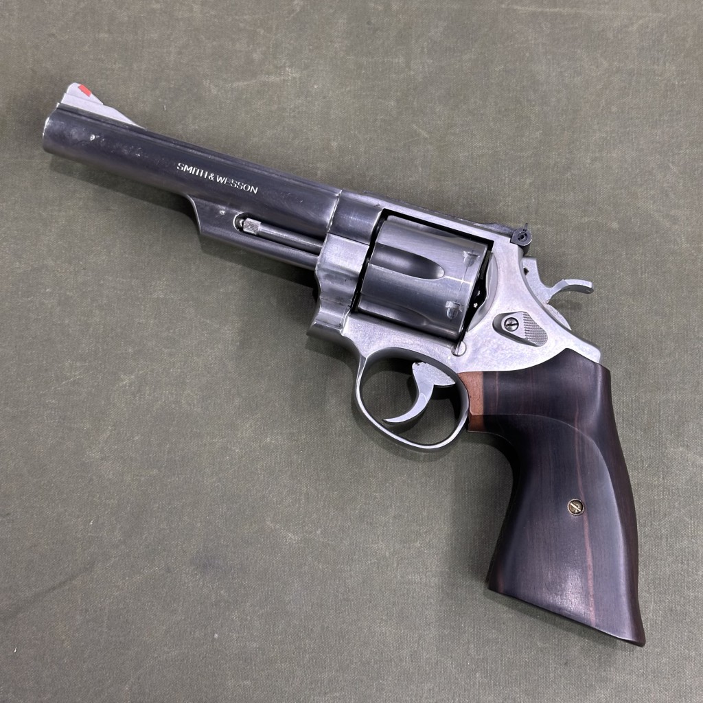 This Smith & Wesson 629-1 is chambered in .44 magnum. The cylinder can hold up to 6 shots. Barrel length is approximately 5.9" in length and is in great condition. Minimal scuffs and scratches, although the stainless steel has dulled a bit.