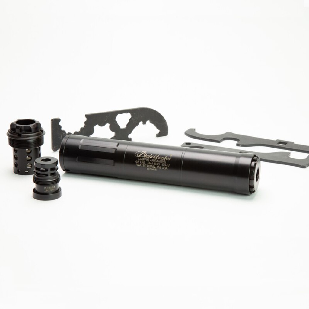 The .46 caliber diameter provides end users with the most caliber flexibility possible, while retaining quality sound suppression. .450 Bushmaster, .458 socom, .45-70 Govt, and other large bore calibers are at home with the Bushwhacker 46. The .30 caliber Paladin blast shield front cap can be interfaced with the Bushwhacker 46 further improving sound performance on the Paladin with 30 caliber and lesser rounds like .308 Win, .300 BLK, and 6.5 Creedmoor.