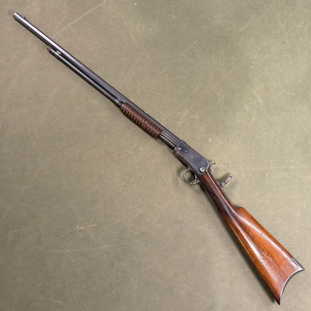 This Winchester Model 1906 is in overall good condition. There are scuffs and scratches on the wooden furniture from previous use. Some of the wood finish on the stock and pump has been rubbed off from consistent use, however there is no significant damage to the wooden furniture.